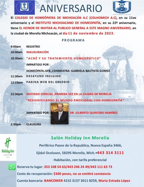 AniversarioEl colegio de homeópatas de Michoacán AC (COLHOMICH AC)en su 11º aniversario y el Instituto Michoacano de Homeopatía, en su 22º aniversario, tiene el honor de invitar al público en...